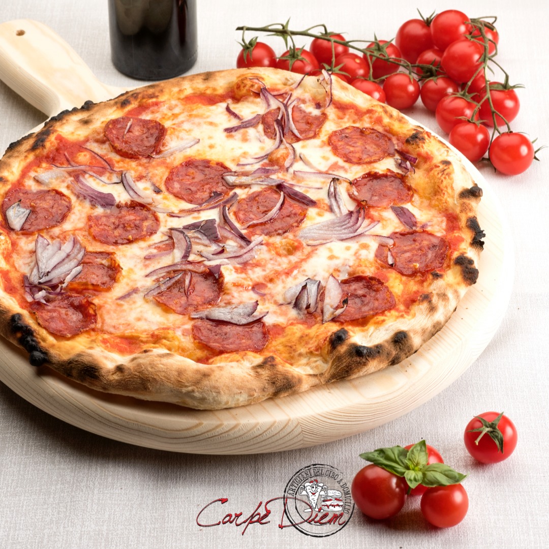 Pomodoro, mozzarella, salame piccante, peperoncino e olive.