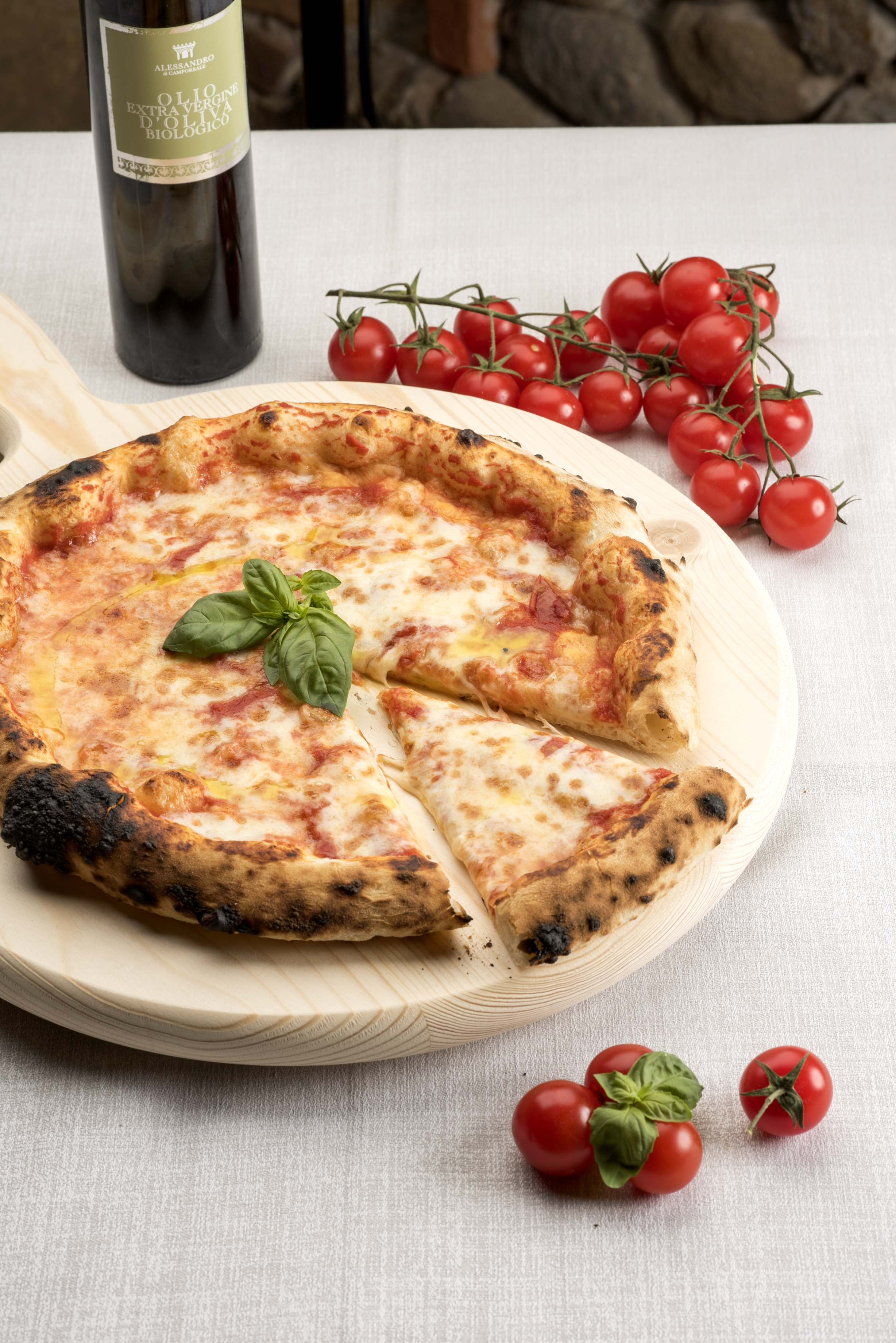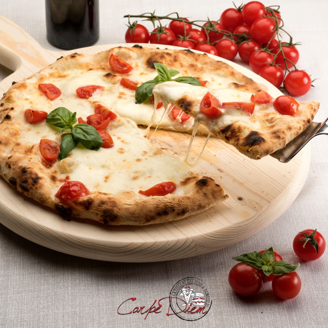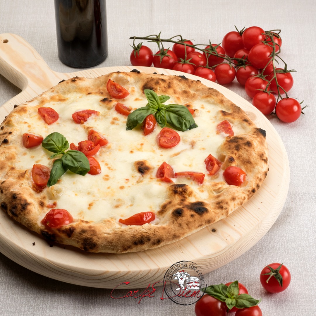 Impasto: basso indice glicemico con lievito madre Pomodoro bio, mozzarella di bufala senza lattosio, basilico e olio evo